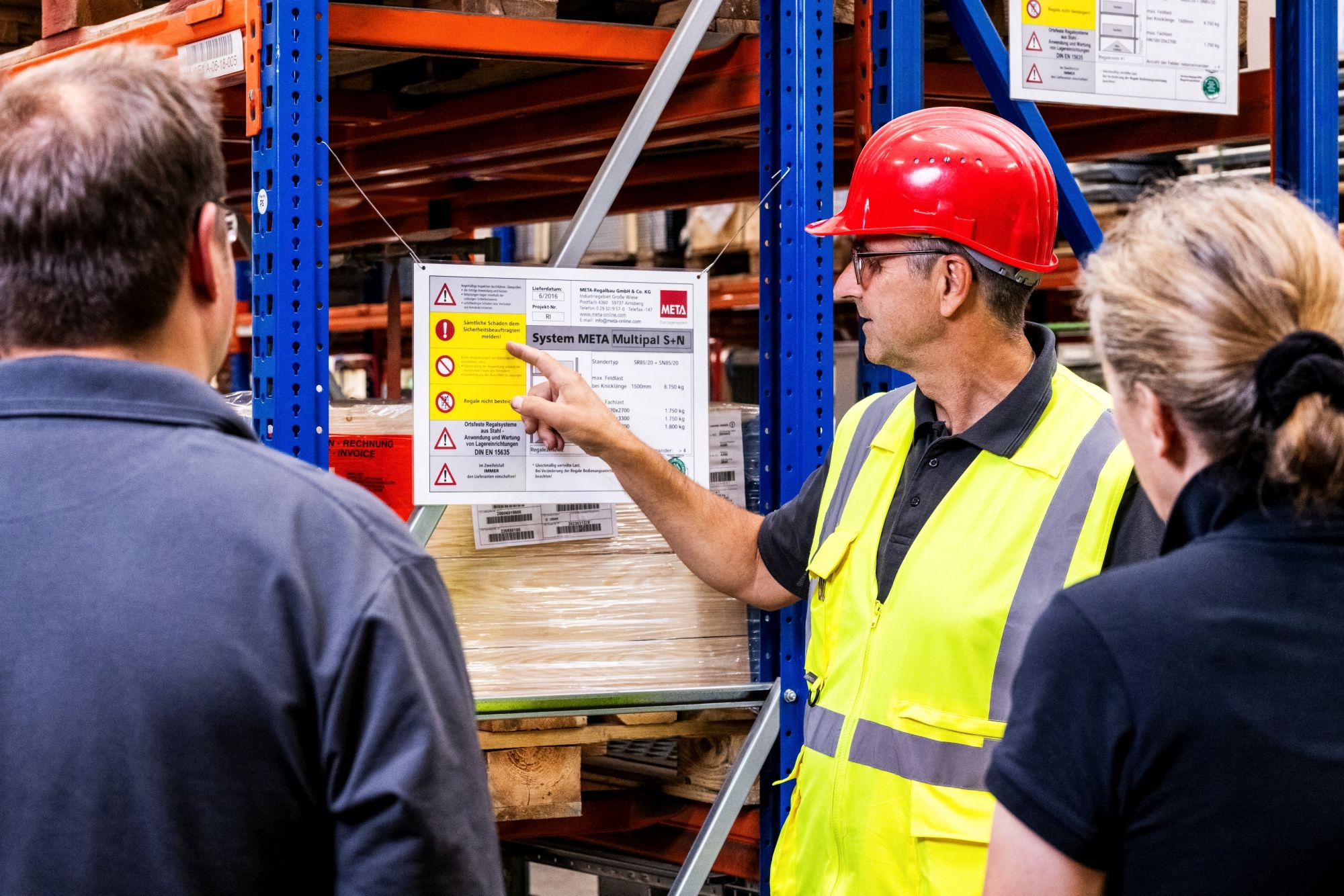 - A gyártó által szállított raktározási berendezések munkagépek, ezért meg kell felelniük a német berendezés- és termékbiztonsági törvény (GPSG) biztonsági előírásainak. Termékeink megfelelnek továbbá a tároló- és munkaeszközök szakmai szövetségének előírásainak, a RAL-RG 614 minőségjelzéssel és a GS-jelöléssel vannak ellátva, és megfelelnek a német társadalombiztosítási intézet DGUV Information 208-061. A META ezért külső ellenőrzésnek van alávetve, amelyet a semleges dortmundi anyagvizsgáló hivatal (MPA) rendszeresen végez.